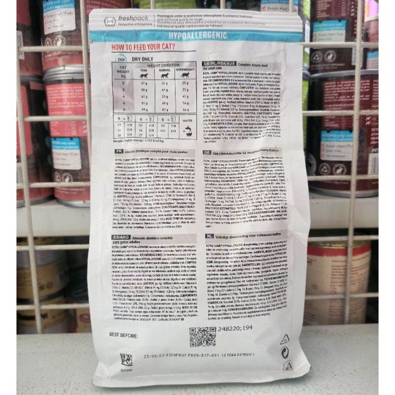 HYPOALLERGENIC adalah pakan yang diformulasikan khusus untuk membantu mengurangi intoleransi bahan makanan tertentu atau alergi makanan pada kucing, biasanya ditunjukkan dengan adanya gejala abnormalitas pada kulit atau pencernaan. pakan ini direkomendasikan untuk bbrp indikasi, antara lain: - Food allergy (alergi pakan) - Food intolerance (intoleransi terhadap pakan) - Inflammatory bowel disease (IBD) - Chronic diarrhoea (diare kronis) - Bacterial growth (pertumbuhan bakteri yg berlebihan di GI track) - Constipation (non-responsive to dietary fibre) - (konstipasi yg tidak bisa diatasi dg pakan diet fiber)