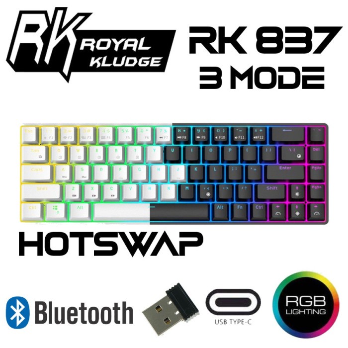 Spesifikasi Royal Kludge RK837: Layout: 65% Keys: 68 Keys Case Material: ABS Keycap Material: ABS Double-Shot Switch: RK Switch Connection: 3-Mode, 2.4Ghz, Bluetooth, Wired Bluetooth Version: 5.1 Backlight: RGB Backlit Port: USB Type-C Kapasitas Baterai: 3150 mAh Misc: - Removable Frame Bezel dapat dilepas untuk menjadikan desain yang lebih minimalis. - Kailh/Gateron Style Hotswap Socket Menggunakan hotswap socket terbaik untuk mechanical keyboard - MacOS / Windows / iOS / Android Support
