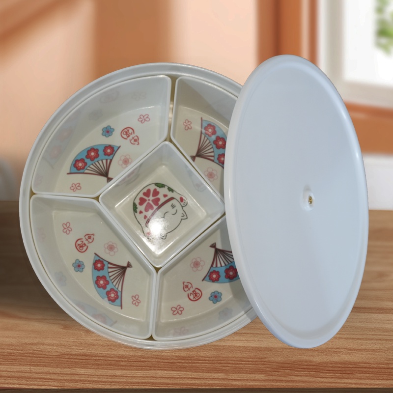 Fitur: 1. Nampan makanan ringan: cocok untuk menyimpan kacang, permen, buah-buahan kering atau makanan ringan lainnya. 2. Desain Multi-grid: ada 5 kompartemen, yang dapat ditempatkan secara terpisah untuk menghindari pencampuran. 3. Penampilan luar biasa: desain berbentuk bunga merupakan dekorasi yang sangat baik untuk rumah Anda. 4. Dengan tutup: Ini memiliki tutup warna yang serasi sehingga dapat melindungi makanan dari debu dan kelembaban. 5. Bahan plastik: terbuat dari PP, tidak beracun, aman dan tahan lama untuk digunakan.