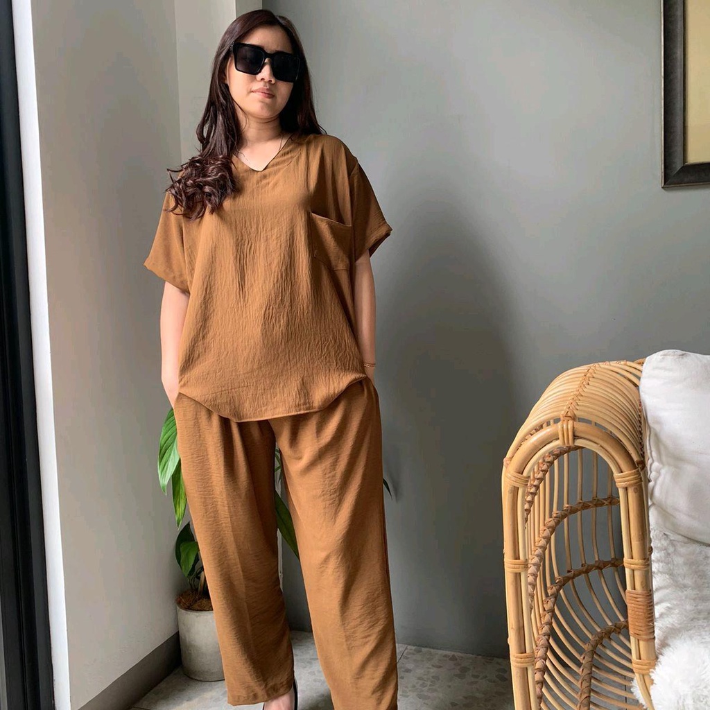 Bahan crinkle Airflow anti lecek halus & adem Model Vneck Ada saku di bagian baju Ada saku dikiri & kanan celana ukuran All size Oversize