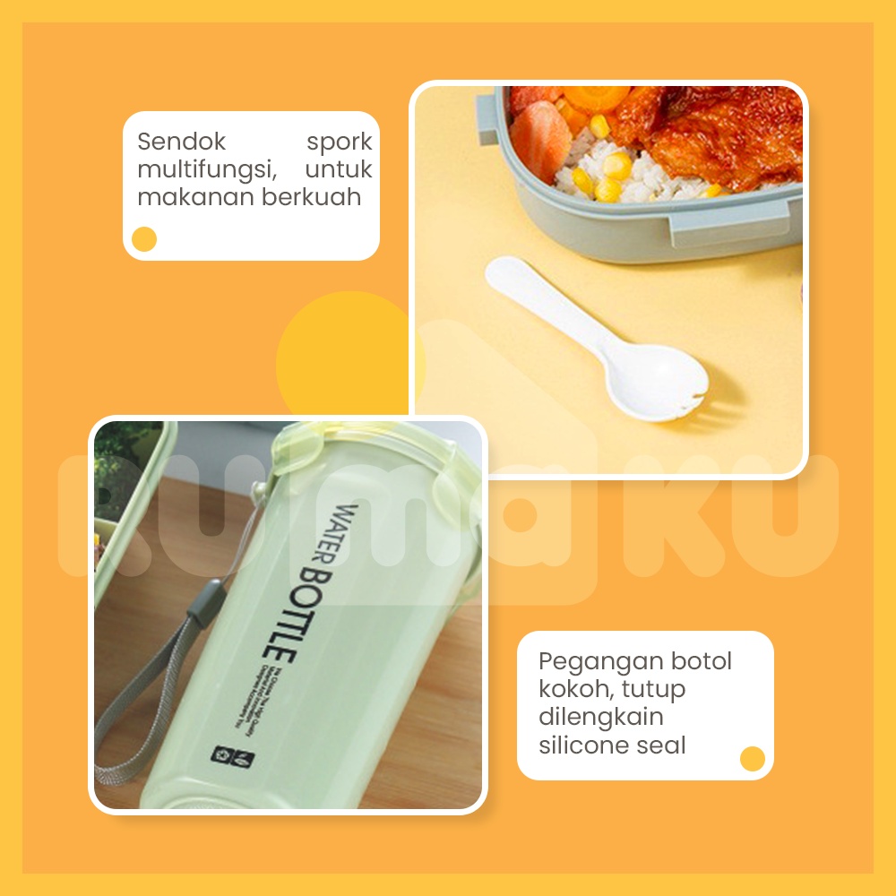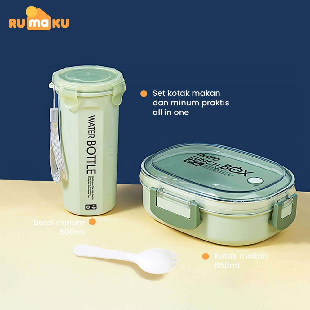 Rumaku Kotak Bekal Set Lunchbox Kotak Makan dan Botol Minum Anti Tumpah 850ml/500ml Tempat Makan Free Sendok