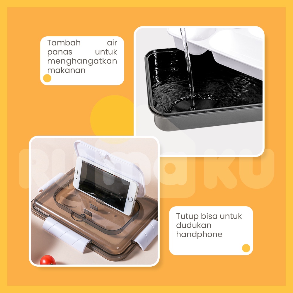 Bahan yang digunakan sudah Food Grade sehingga aman untuk segala jenis makanan Kotak makan yang terdiri 2 layer, lapisan atasnya merupakan wadah 4 sekat bahan PP food grade dan uniknya lagi dapat ditambahkan air panas pada bagian bawah untuk menjaga agar makanan tetap hangat.