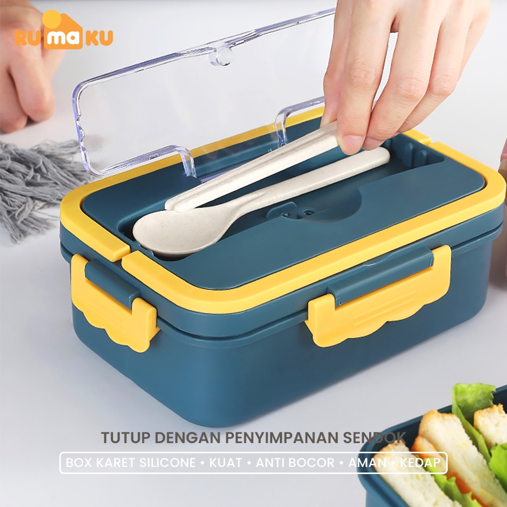 Berikut masih ada beberapa keunggulan yang ada pada Rumaku Lunch Box Doset ini : 1. Silicone Seal yang ada pada tutup kotak makan, membuat lunch box tetap kedap udara, sehingga suhu makanan tetap terjaga 2. Snap Lock yang besar dan kuat, menjamin makanan kamu tidak mudah tumpah saat dibawa kemana mana 3. Mangkuk Sup yang memiliki lubang sirkulasi, menjaga makanan tidak mudah bau 4. Cover makanan yang tersedia tempat sendok dan sumpit, multifungsi bisa digunakan untuk holder 5. Handle Built In, yang besar dan kuat aman anti slip