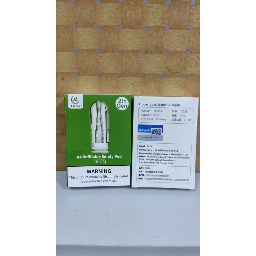 RUOK CARTRIDGE COMPATIBLE FOR RELX INFINITY . RUOK R4 Refillable Pod untuk RELX Infinity dan RELX Essential. Menggunakan coil mesh 1.0 ohm yang menghasilkan rasa yang lebih baik, cloud yang lebih banyak, dan TH yang lebih soft. Coil mesh di Pod ini menggunakan teknologi Reewape RUOK yang fokus pada pengingkatan rasa. Teknologi ini secara ketat mengelola kualitas bahan dan sepenuhnya mengeluarkan cita rasa e-liquid yang digunakan.