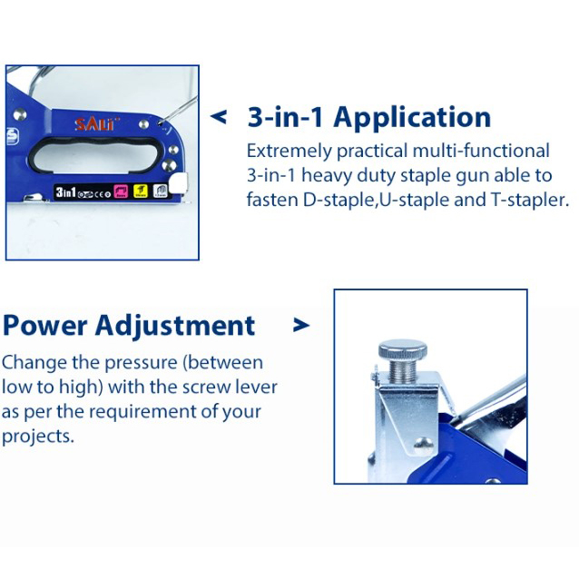 Fitur Didesain 3 in 1 Salah satu keunggulan menggunakan stapler yang satu ini adalah dirancang 3 in 1 sehingga dapat digunakan pada beragam penggunaan. Pertama ada U-Stapler, yang digunakan untuk merekatkan kabel pada material kayu atau semacamnya. Kedua terdapat T- Stapler, biasa digunakan untuk memasang kain pada material kayu. Ketiga adalah D-Stapler, dapat digunakan untuk merekatkan kedua material seperti kayu dengan kayu dan semacamnya.