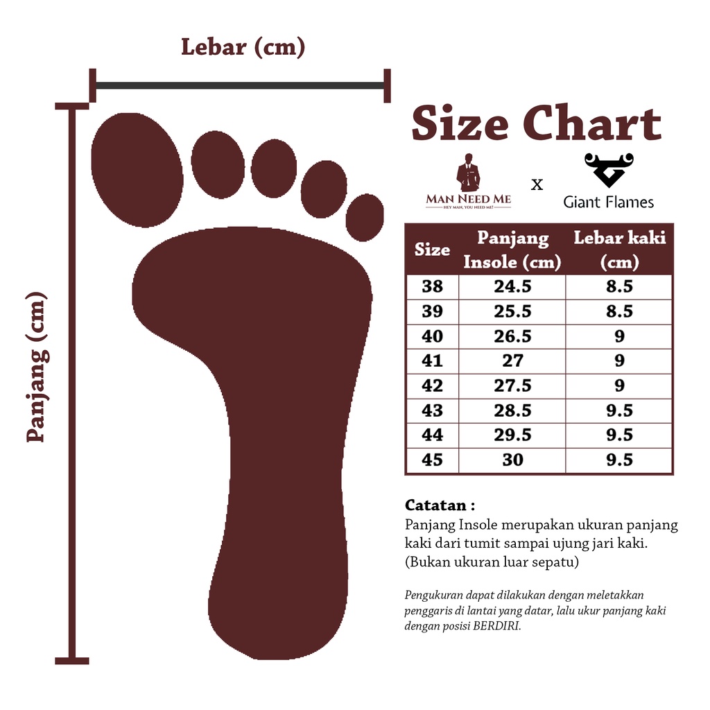 Size Chart : (Panjang Kaki = PK) Size 38 : PK : 24.5 cm Size 39 : PK : 25.5 cm Size 40 : PK : 26.5 cm Size 41 : PK : 27.0 cm Size 42 : PK : 27.5 cm Size 43 : PK : 28.5 cm Size 44 : PK : 29.5 cm (Cara Pengukuran : Lihat di panduan ukuran)
