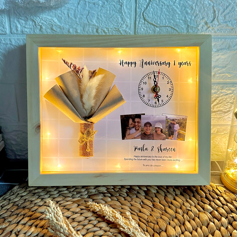 Detail Produk : 📌Desain dapat request (tulisan, foto, warna background, tema) 📌Bingkai terbuat dari kayu jati belanda 📌Ukuran bingkai 25x20 cm 📌Terdapat variasi pakai lampu 📌Terdapat KACA di depan bingkai sehingga dapat melindungi foto dan bunga 📌Bunga yang digunakan yaitu bunga kering dan bunga yang diawetkan sehingga tahan lama 📌Sebelum produk dikirimkan, customer akan diperlihatkan untuk preview desain sebelum di cetak