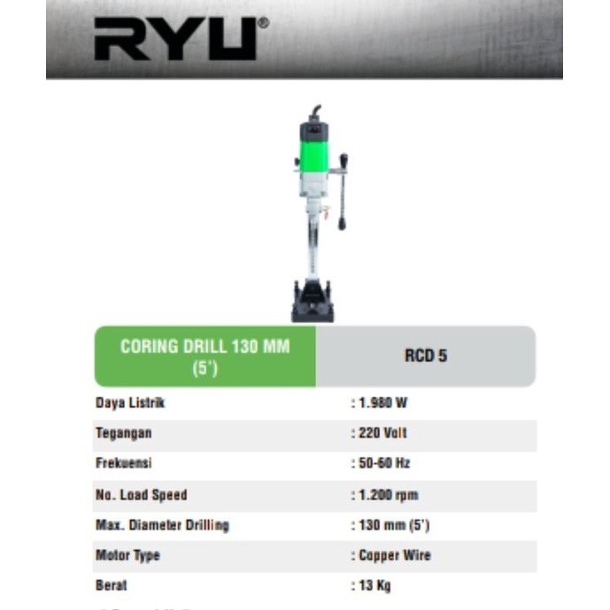 Daya Listrik : 1.980 watt Tegangan : 220 Volt Frequensi : 50-60 Hz No Loads speed : 1.200 Rpm Max Diameter Drilling : 130mm Motor Type ; Copper Wire Berat : 13 Kg Ukuran : 5 inchi Unit Baru dan asli RYU Gransi Resmi 6 Bulan
