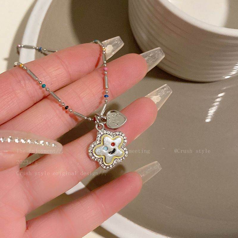 Aksesoris Fashion > Kalung > Rantai & Link > S925 Kalung Silver Dengan Bentuk Wajah Bunga Matahari Smiley Face Warna-Warni Gaya Korea Fashion Untuk Wanita