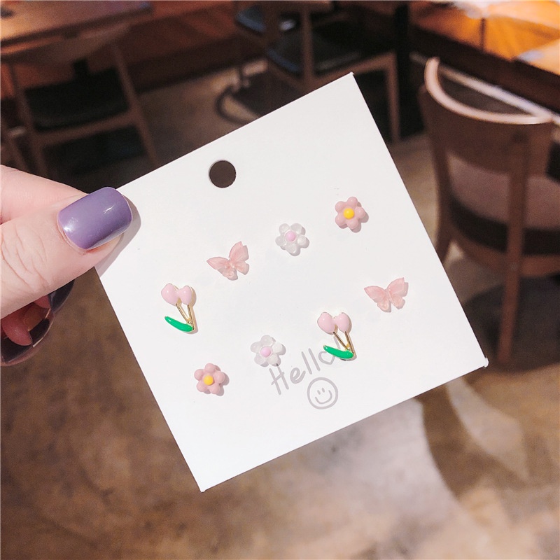 Detail S925 Perak Jarum Bunga Tulip Anting Set Mini Fashion Kupu-Kupu Anting Korea Retro Anting Wanita