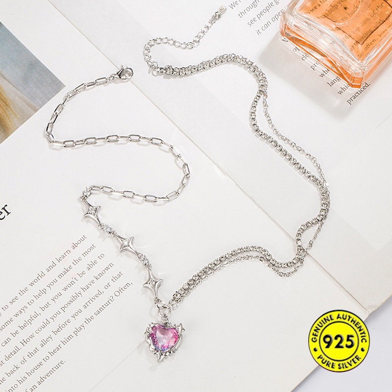 Detail S925 Perak Merah Muda Hati AAA Zirkon Kalung Cahaya Mewah Rasa Tinggi Ornamen U1745