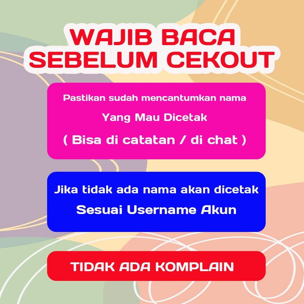 CARA ORDER : - Tentukan nama yang mau di cetak, Bisa 1 kata atau 2 kata - Kirim data pesanan saat cekout di note/catatan ( Jika tidak ada maka kami cetak sesuai nama akun )