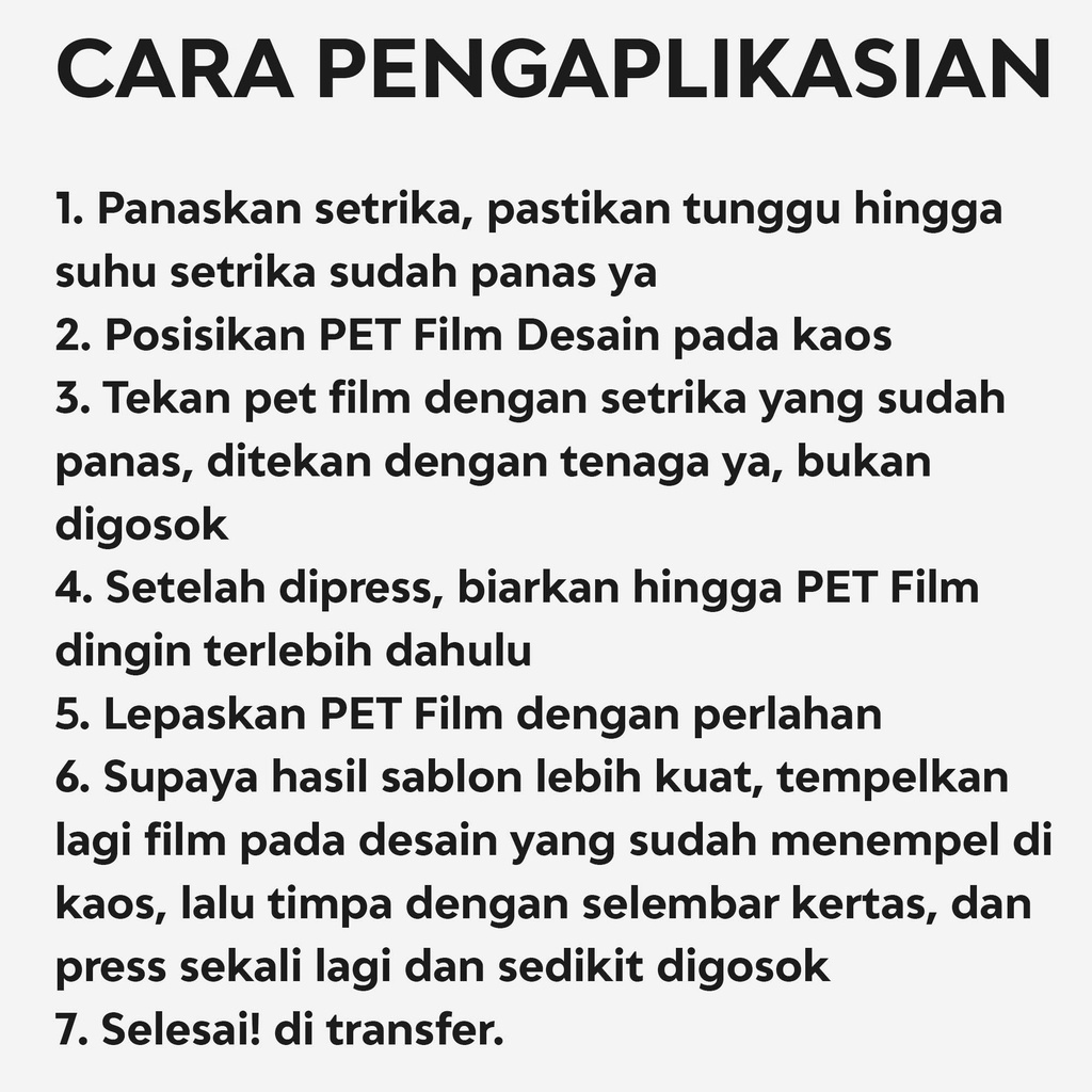 Produk ini hanya PET Film yang dapat dipress langsung ke kaos. Kami tidak langsung press di kaos ya, jadi produk yang diterima nanti hanya berupa PET Film, dan bisa dipress sendiri.