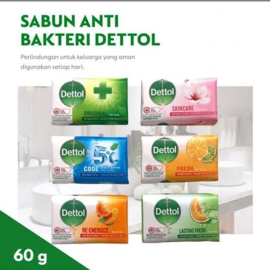 Varian Dettol Bar Soap: - Sensitif - Fresh: Kesegaran citrus dan dilengkapi ekstra pelembab. - Invigorate - Cool - Kesegaran Menthol - Re-Energize - Lasting Fresh : Kesegaran yang tahan lama. - SkinCare dengan Multivitamin - Original: Keharuman kesegaran cemara yang khas