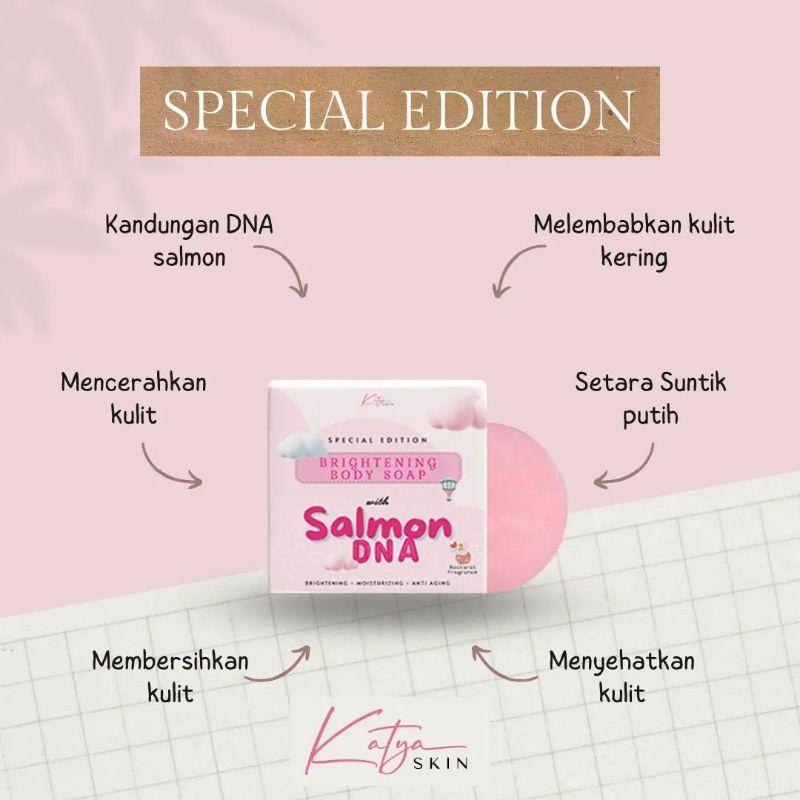 BRIGHTENING BODY SOAP WITH SALMON DNA adalah sabun pemutih badan dari Katya Skin yang berfungsi untuk memutihkan kulit secara alami. Produk ini aman digunakan oleh bumil & busui dan boleh dipakai untuk anak usia 1 tahun ke atas. Sabun pemutih dengan bahan dasar Salmon DNA ini sudah terdaftar di BPOM dengan nomor NA18220500565.