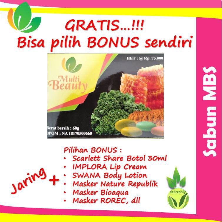 PROMO..!! Setiap ORDER Pembelian Sabun MULTIBEAUTY "Bijian/selain Grosir" dapat pilihan "BONUS GRATIS" : >> Scarlett Whitening Lotion 30ml + Jaring Busa, atau >> Masker NATURE REPUBLIC + Jaring Busa, atau >> Masker BIOAQUA Aloevera + Jaring Busa, atau >> IMPLORA Pensil Alis + Jaring Busa, atau >> SWANA Body Lotion + Jaring Busa, atau >> VIVA Air Mawar + Jaring Busa, atau >> Masker Gelatin untuk Komedo + Jaring Busa. >>> Berlaku utk ORDER "BIJIAN/Bukan Grosir" Minimal 2 biji dapat BONUS : (Implora Lip Cream, Maycreate, dll) + Jaring Busa