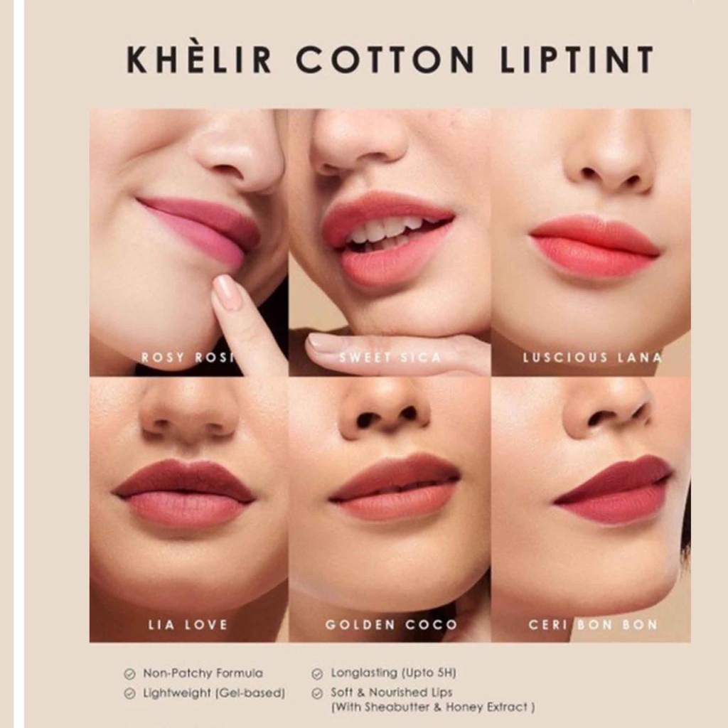 Khelir Cotton Liptint dapat membuat bibirmu tampil indah dan natural dalam hitungan detik, dengan formula berbasis gel yang dapat menyerap sempurna, memberikan warna yang tipis natural hingga warna bibir yang bold tanpa rasa kering. Memiliki kandungan skincare untuk menutrisi bibirmu yaitu Vitamin E, Shea butter, Coconut Extract, Honey Extract, and an anti-aging agent yang membuat bibir mu tampak sehat, melembabkan dan terawat sepanjang hari. ☑Non-Patchy Formula ☑Lightweight (Gel-based) ☑Longlasting (Upto 5H) ☑Soft & Nourished Lips (With Sheabutter & Honey Extract ) ☑Moist & Calming (With Coconut extract) ☑Antioxidant (With Vitamin E) ☑ Youthful Lip (With Anti Aging Agent)
