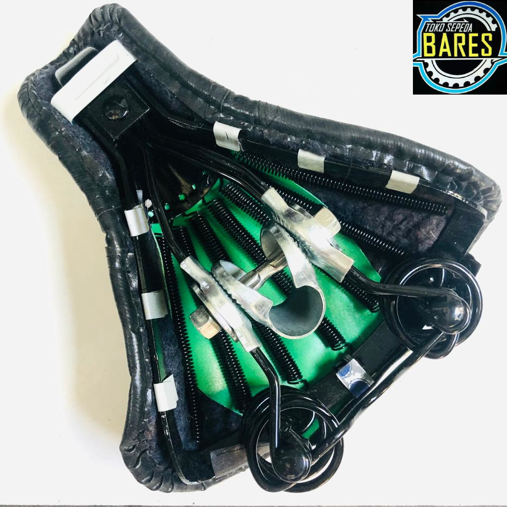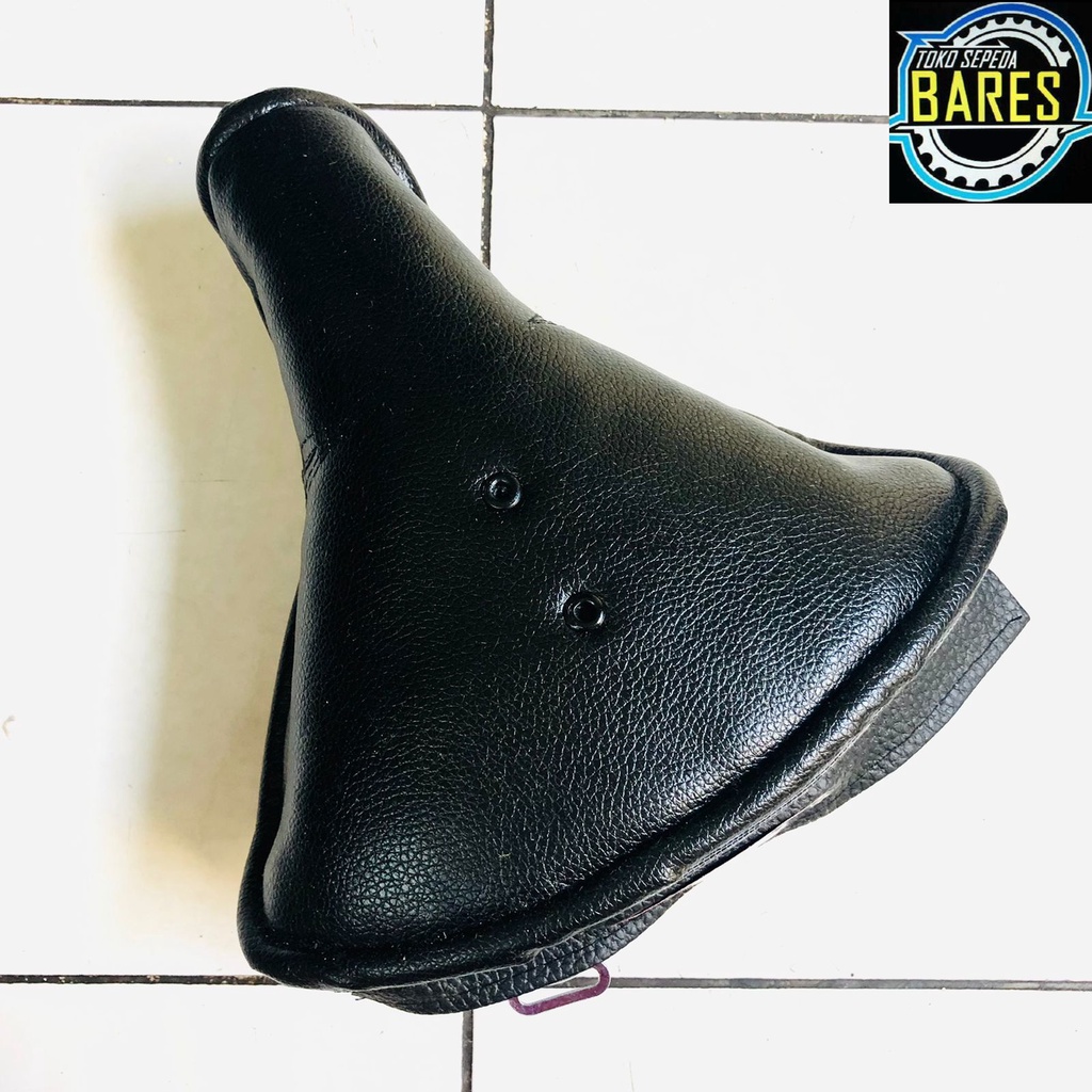 Sadel Sepeda Jengki Kulit - Varian: Qianglik / OK - Bahan: Besi dan Kulit Sintetis - Warna: Hitam - Cocok untuk sepeda jengki - Notes: Model OK kondisi reject (rijek), ada sobekan kecil