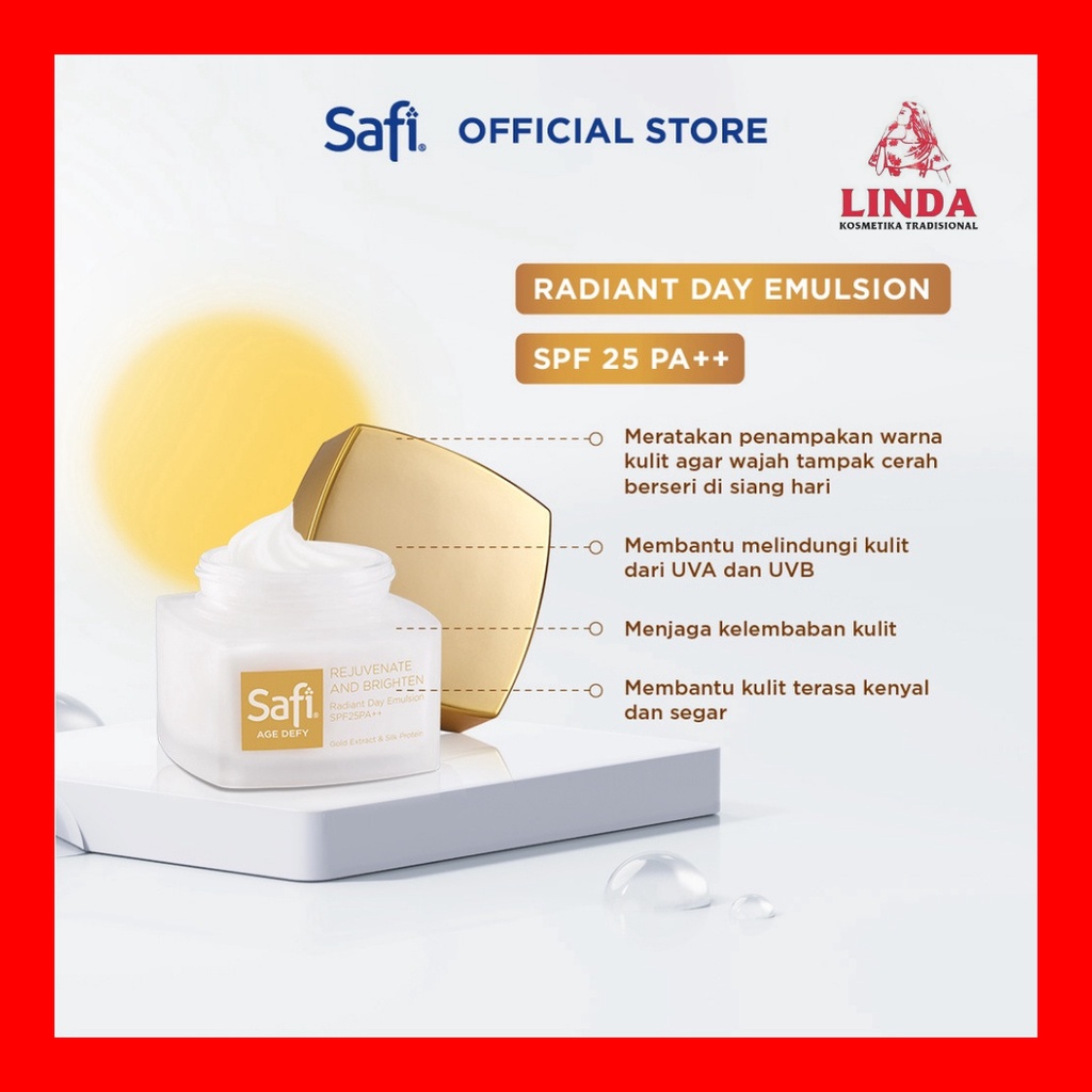 Cara Pakai : Usapkan pada wajah dan leher. Pijat dengan gerakan memutar. Gunakan pada pagi hari setelah penggunaan Safi Age Defy Toner dan Safi Age Defy Gold Water