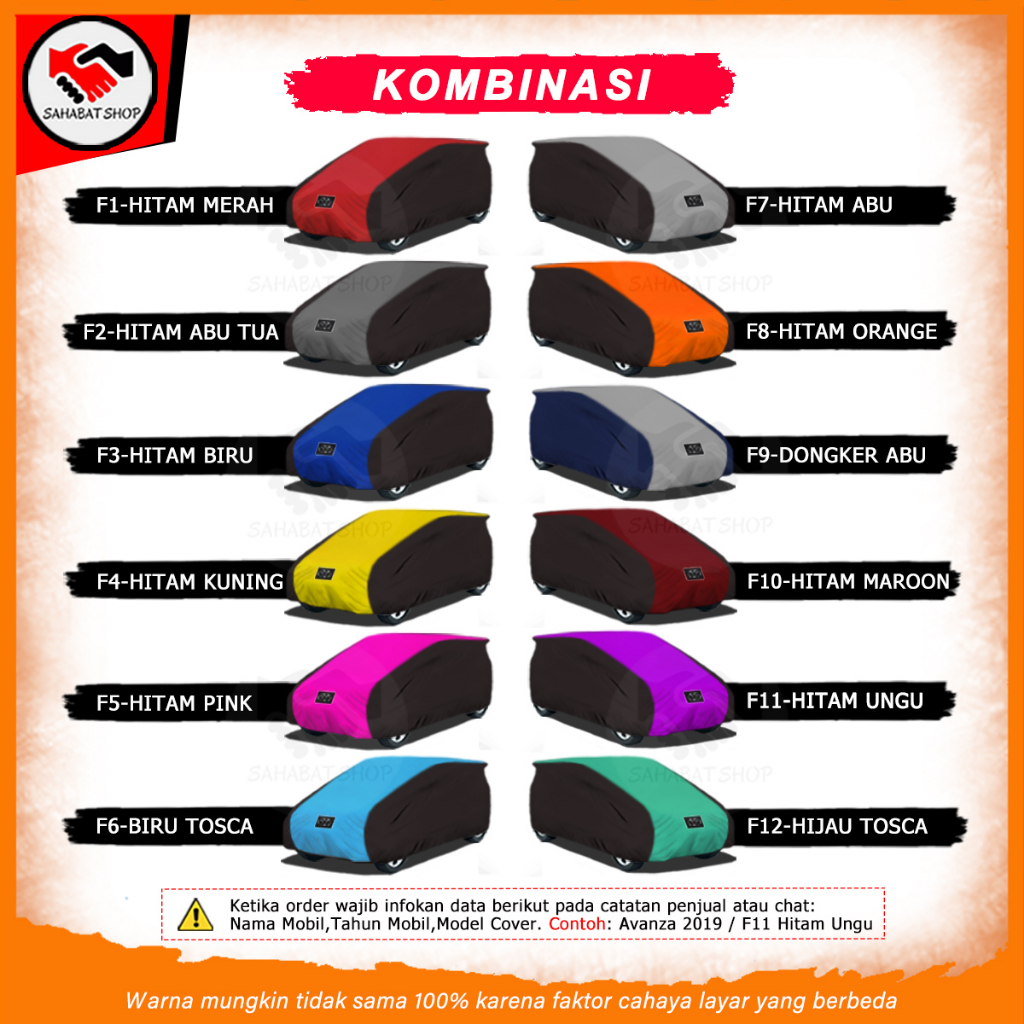 Pertanyaan yang sering ditanyakan oleh pembeli: MOHON DIBACA BAIK-BAIK YA… __________________ Pembeli : Covernya memakai bahan apa? Jawaban : Kami memakai bahan khusus untuk membuat cover mobil yaitu Despo Wp Import Korea yang kualitasnya sudah dibuktikan ribuan pembeli dengan ulasan 97% sangat baik. __________________ Pembeli : Ini waterproof 100% gak rembes air sama sekali? Jawaban : Kami selalu memberikan bahan yang berkualitas namun pada dasarnya bahan yang ini masih rember air tapi sangat baik untuk melindungi mobil dari sinar matahari, debu, goresan dan kotoran. Silahkan bisa chat ke admin kami agar bisa dikirimkan katalog cover waterproof yang ketahanan air diatas 95%, karena tidak ada jaminan untuk produk yang dijahit pasti ada kemungkinan rembes ya kak… __________________ Pembeli: Aman untuk mobil putih dan luntur tidak ya kak? Jawaban: Kami selalu menyeleksi dan melakukan QC pengujian sample bahan secara berkala untuk menjaga kualitas bahan dan memastikan tidak luntur bahkan aman dipakai mobil putih sekalipun Kami memberikan GARANSI 100% UANG KEMBALI jika terbukti luntur __________________ Pembeli: Apakah cover yang diorder pasti sesuai? Jawaban: Kami selalu mengirimkan cover sesuai yang diorder, untuk itu ketika checkout pembeli wajib infokan data berikut di catatan penjual : nama mobil, tahun mobil dan model covernya termasuk jika mobil sudah ada modifikasi seperti memakai rak atau tanduk. CONTOH : CIVIC TYPE R 2019 / MERAH-HITAM __________________ Pembeli: Jika terjadi masalah atau barang tidak sesuai bagaimana ya kak? Jawaban : Beruntung karena kaka belanja di toko kami, karena kami memberikan garansi full yaitu: - JIKA LUNTUR UANG KEMBALI 100% - JIKA UKURAN KEKECILAN KEBESARAN - JIKA WARNA TIDAK SESUAI - JIKA LOGO TIDAK SESUAI - JIKA ADA MASALAH LAINNYA, BISA DIBICARAKAN MELALUI FITUR CHAT DI TOKO KAMI [ Garansi berupa penukaran produk baru dan semua biaya termasuk ongkir PP kami yang tanggung ] __________________