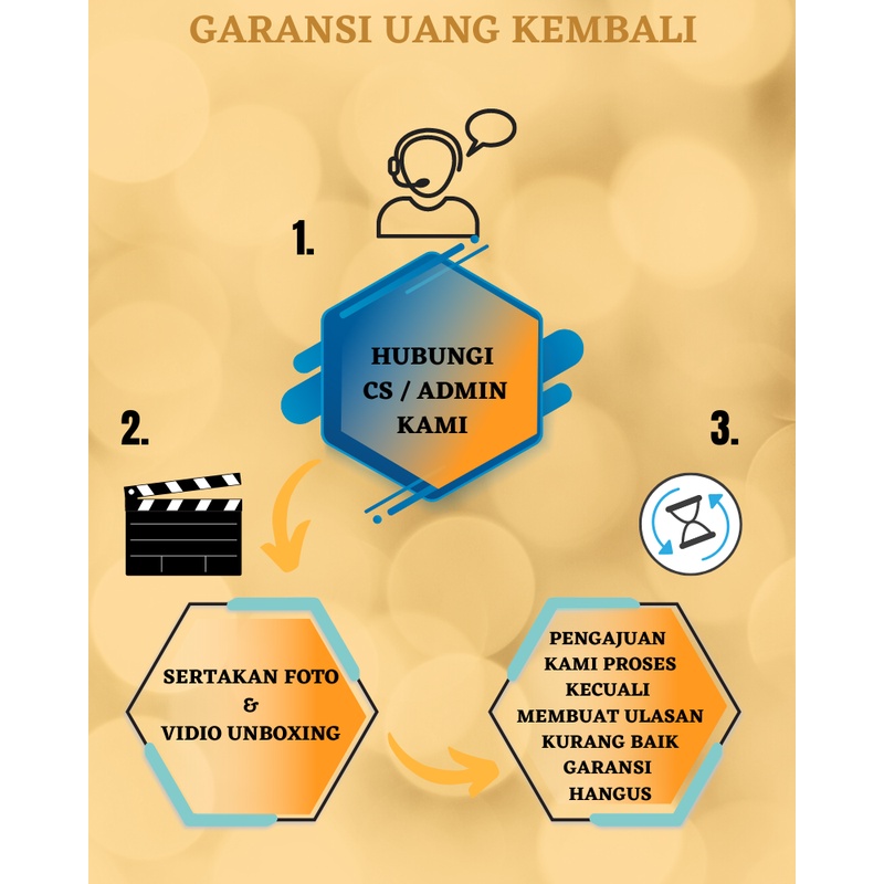 Jika barang yang kk terima ada kekurangan ataupun kesalahan mohon kesediaan nya ya untuk memaklumi itu mungkin ada kesalahan di bagian packing dan QC, kk langsung chat kami via aplikasi pemesanan kk kami akan respon dan jika memang betul kesalahan dari pihak kami kami akan ganti 100% tanpa ada tambahan biaya lagi, Terimakasih ^_^ Seperti yang sudah di jelaskan di gambar atas, foto dan video produk di toko kami 100% hasil karya fotograper kami bukan hasil download google jadi mohon maaf jika foto nya kurang baik, :-D
