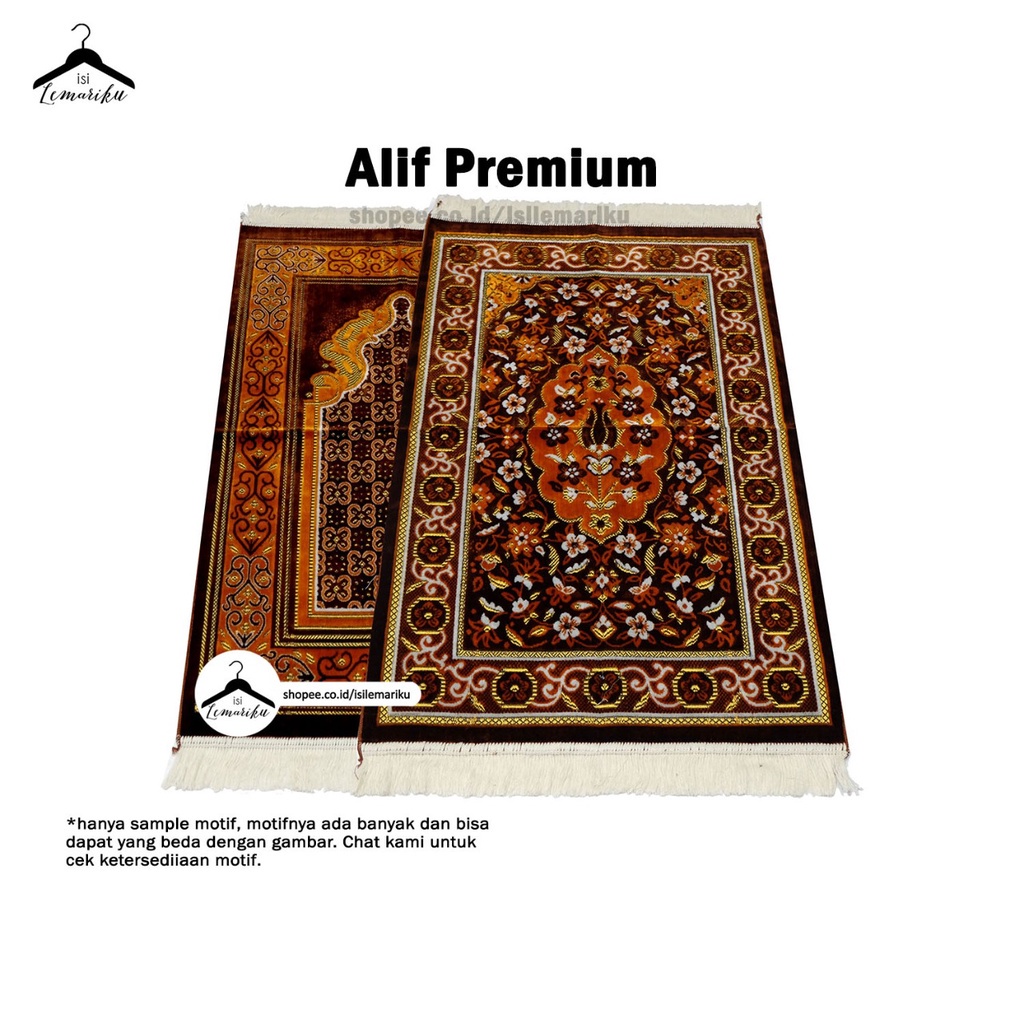 Produk ini campuran beberapa merk sajadah: Al Arabia, Armaan, Alif,Karishma dan Kohinoor (tergantung stok). Kualitas, bahan dan harga sama. Pembeli dipersilakan memilih warna, sedangkan Motif & Merk akan diberikan random/sesuai ketersediaan.