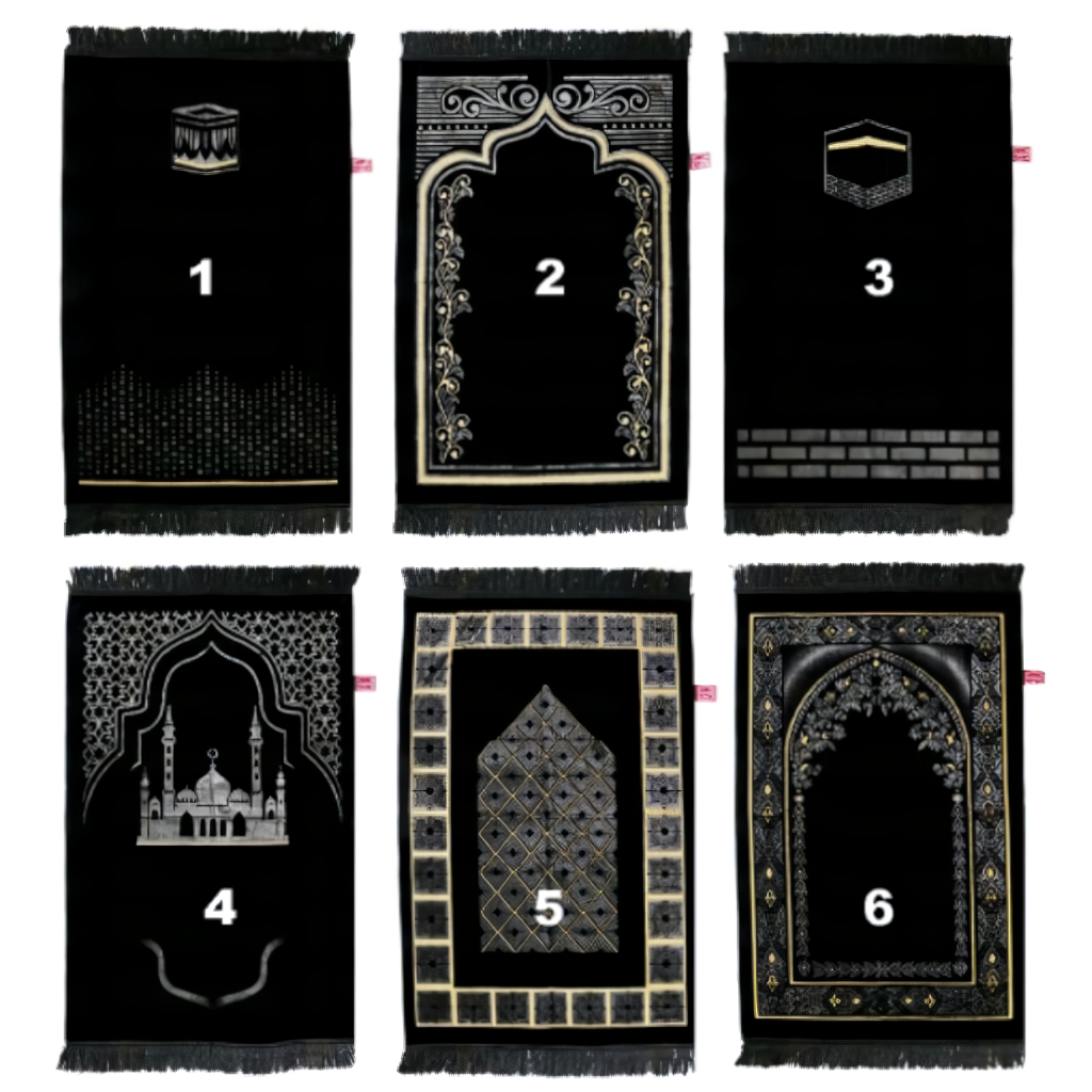 Sajadah Turkey Tebal Hitam Warna dasar hitam dengan kombinasi abu abu Bahan tebal dan halus