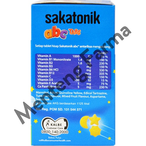 Komposisi : Setiap tablet hisap Sakatonik abc mengandung : - Vitamin A 1000 IU - Vitamin B1 1.4 mg - Vitamin B2 1.6 mg - Vitamin B3 9 mg - Vitamin B6 2 mg - Vitamin B12 3 mcg - Vitamin C 60 mg - Vitamin D3 100 IU - Vitamin E 5 mg - Ca Pantothenate 5 mg - Mannitol, Edicol Quinoline Yellow, Edicol Tartrazine, Tutti Fruti Flavour, Mixed Fruit Flavour, Aspartam
