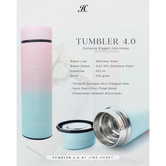 Details Brand: Jims Honey Tumbler Ver 4 Jims Honey Material bagian dalam: SUS 304 (Stainless steel) Terdapat saringan kecil dibagian atas Kapasitas: 425 Ml Hand wash Only (tidak boleh dimasukkan kedalam Microwave)