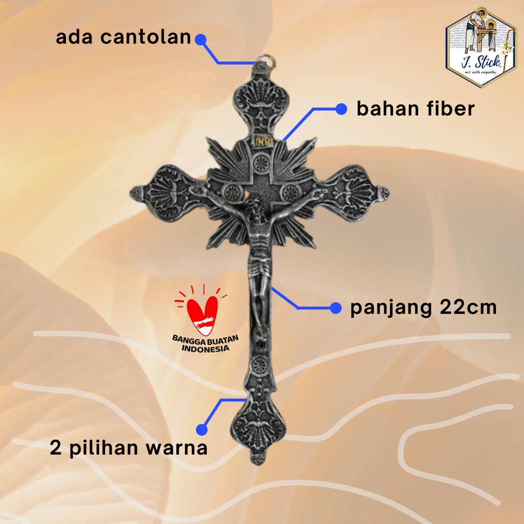 1️⃣ Salib bahan fiber dengan ornamen menarik dan terdapat Corpus (Yesus) 2️⃣ Ukuran : tinggi 22 cm, tebal 0,75 cm 3️⃣ Pilihan Warna : Silver (Perak / abu abu) & Bronze (tembaa / coklat) 4️⃣ Sudah ada cantolan di atas salib, sehingga tinggal gantung di dinding 5️⃣ Kemasan : bubble wrap dan kardus, Tanpa tambahan biaya