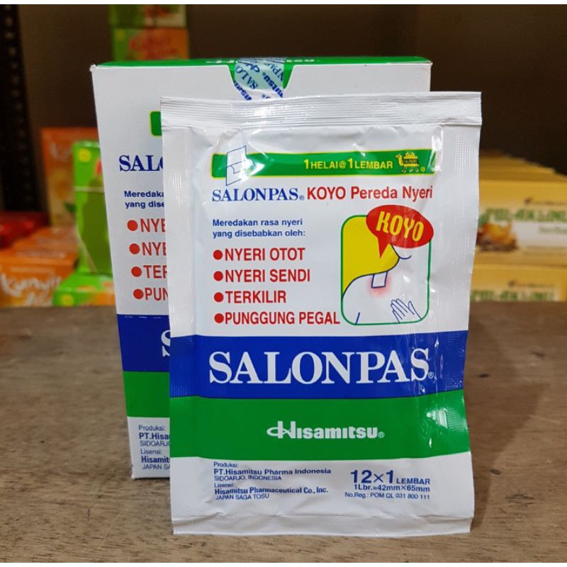 Salonpas Koyo 12pcs x 1 Lembar. Harga tertera adalah per 1 Lembar isi 12pcs. Deskripsi Produk: Meredakan rasa nyeri yang disebabkan oleh kelelahan otot, nyeri otot, kekakuan leher, punggung pegal, sakit kepala, sakit gigi, memar, terkilir, dan nyeri sendi