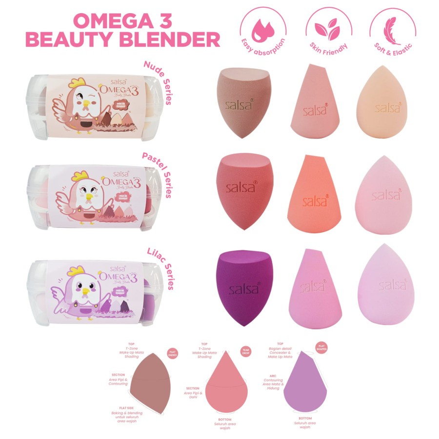 Dengan beragam varian warna yang cantik, SALSA Omega 3 Beauty Blender dapat digunakan untuk segala jenis powder maupun liquid makeup. Lembut di kulit dan elastis, memudahkan aplikasi makeup. Tersedia dalam 3 varian (masing-masing berisi 3 Beauty Blender) : - Nude Series - Pastel Series - Lilac Series