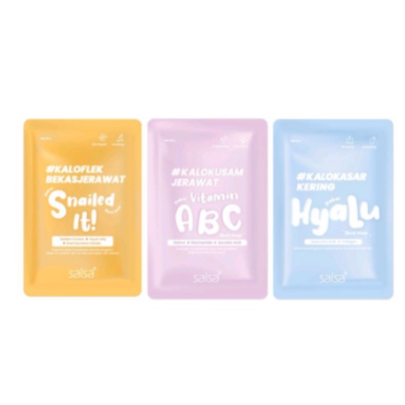 SALSA Sheet Mask hadir dalam 3 varian untuk setiap kebutuhan kulitmu: - SALSA Vitamin ABC Sheet Mask (Pink) dengan Retinol, Niacinamide, dan Ascorbic Acid untuk mencerahkan, menenangkan kulit kemerahan dan mencegah jerawat, serta menguatkan skin barrier