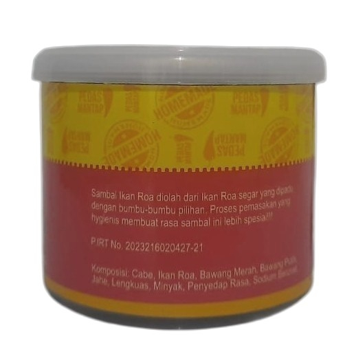 Komposisi : cabe, Ikan roa, bawang merah, bawang putih, jahe, lengkuas, minyak, penyedap rasa dan sodium benzoat
