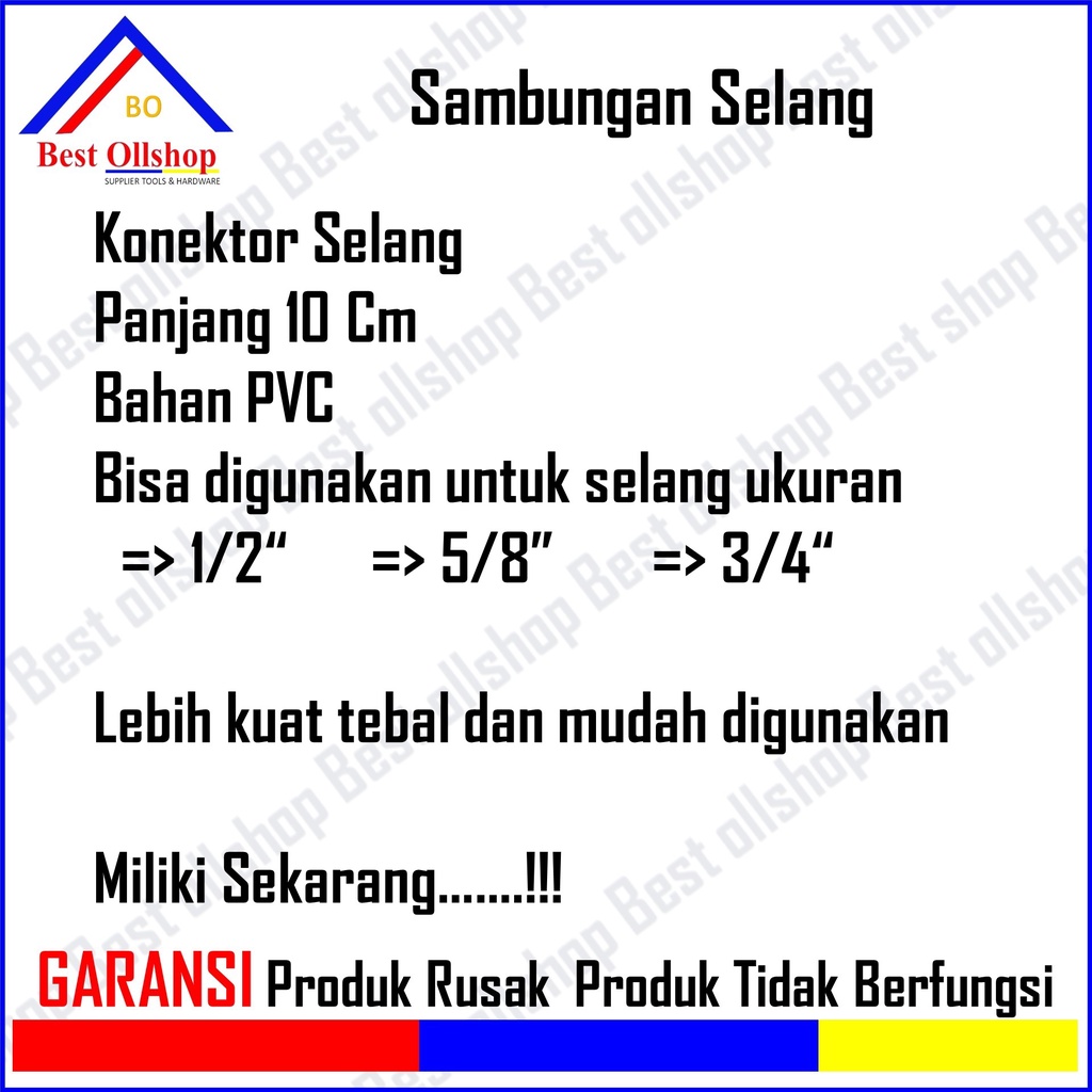 Sambungan selang Alat konektor selang Panjang 10 cm Bahan Pvc Bisa digunakan untuk selang ukuran => 1/2 inch => 5/8 inch => 3/4 inch Harga yang tertera adalah harga perbiji