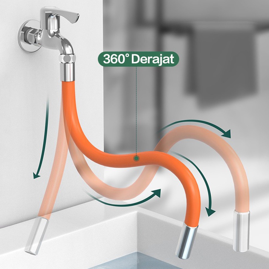 Sambungan untuk kran air wastafel/kamar mandi terbuat dari bahan stainless + silikon yang elastis dan praktis yang berfungsi untuk memperpanjang pancuran air sehingga mudah bagi si kecil untuk mencuci tangannya sendiri. Selain mengeluarkan pancaran air lebih jauh dan luas sambungan kran ini juga dapat membantu kita untuk menyiram sampah sisa makanan pada sela-sela wastafel.