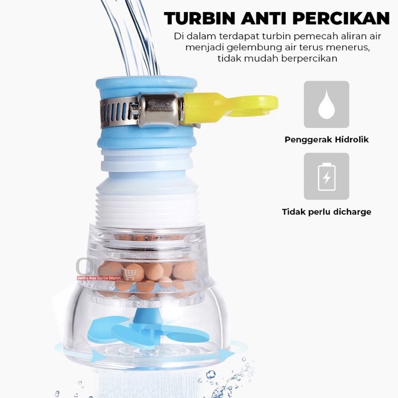 Tidak hanya itu, sambungan kran ini dapat menghemat air hingga 50%, air yang keluar dari mulut sambungan kran berbentuk bunga air sehingga pemakaian air jadi lebih irit. Aliran air jadi terasa lebih deras, membersihkan piring atau makanan jadi lebih cepat dan air kran tidak muncrat kemana-mana.