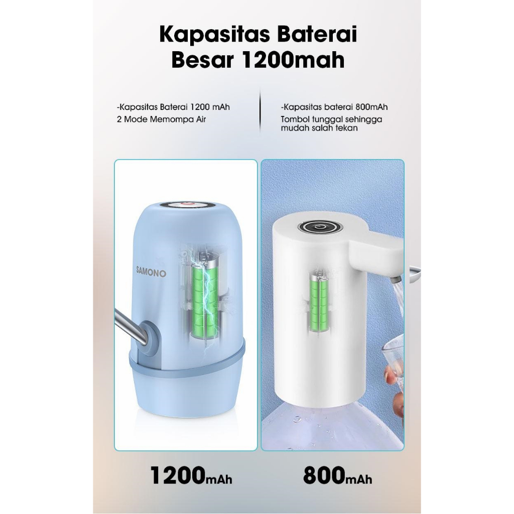 Pompa Air Galon Elektrik Memudahkan Anda mengambil air dari galon. Mempunyai 2 mode untuk memompa air dan kapasitas baterai 1200 mAh. Produk ini juga mempunyai desain nirkabel - aman, mudah digunakan dimana saja dan kapan saja, dan desain ergonomis. Produk ini terbuat dari bahan Silikon Food Grade Kompatibel dengan air kemasan 4.5L-18.9L.
