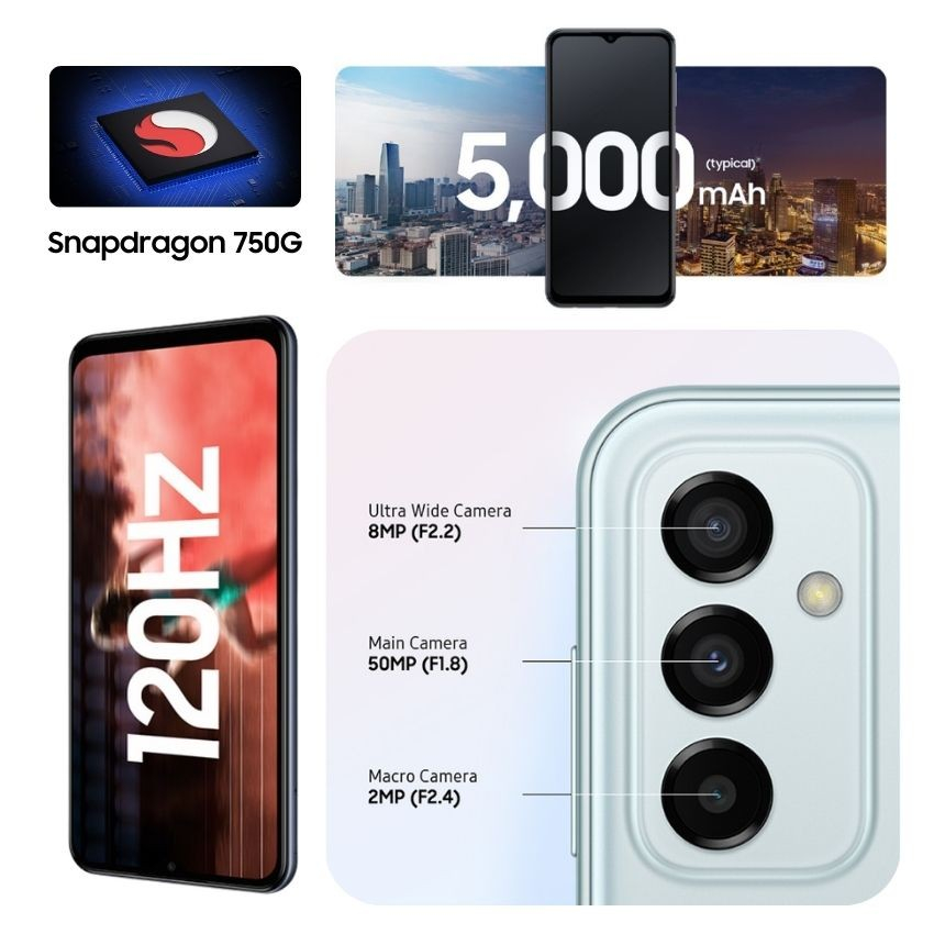 Samsung Galaxy M23 memiliki dua varian kapasitas memori, yaitu 4/128GB dan 6/128GB. Smartphone ini memiliki resolusi kamera utama 50 MP dan kamera selfie 8 MP dilengkapi fitur LED flash, panorama, dan HDR. Samsung Galaxy M23 dibekali chipset Snapdragon 750G dengan ukuran layar 6.6 inci berteknologi TFT LCD.