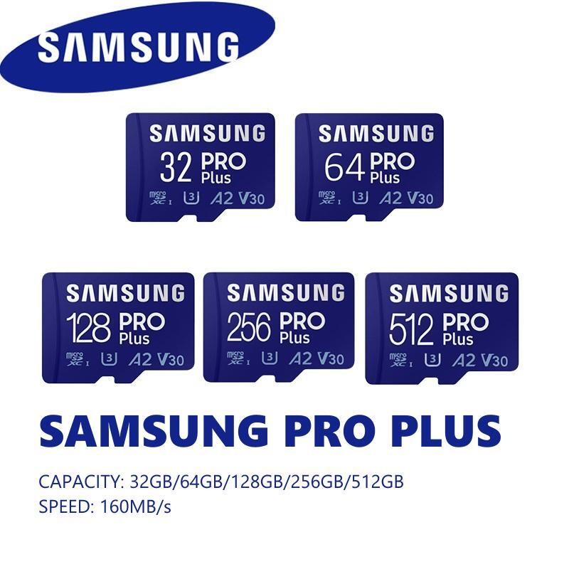 ✨SAMSUNG PRO PLUS-BLUE - Class : U3, V30, A2 - Capacity: 32GB,64G, 128G, 256G, 512G Speed : Read : up to 160MB/s, Write : up to 120MB/s * Actual speed may vary depending on the conditions and environment in which the host device is used.