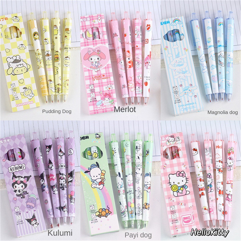 San4 Buah/Kotak Sanrio Pena Tekan Kartun Siswa Cepat Kering Kuromi Gel Pena Hitam 0.5M Pena Siswa Lucu untuk Hadiah Kawaii Anak-anak