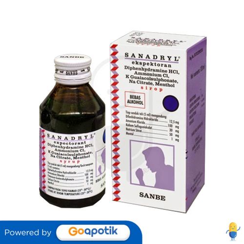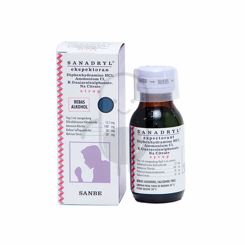 Deskripsi : Sanadryl merupakan obat yang digunakan untuk meredakan batuk produktif yang disebabkan reaksi alergi | Komposisi : Tiap 5 mL sirup mengandung diphenhydramine HCl 12.5 mg, ammonium klorida 100 mg, K-guaiacolsulfonate 30 mg, Natrium citrate 50 mg, mentol 1 mg | Dosis : Dewasa : 2 sendok teh (10 mL), 3-4 kali sehari. Anak-anak : 1 sendok teh (5 mL), 3-4 kali sehari | Indikasi : Meredakan batuk produktif yang disebabkan reaksi alergi | Perhatian Khusus : Penyakit hati, Asma, Glaukoma, MAOI, Hamil, Anak, Mempengaruhi kemampuan mengemudi/menjalankan mesin. | Kemasan : Botol 60 mL sirup | NIE : DTL7822209237A1