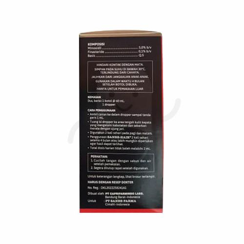 Deskripsi: PENGGUNAAN OBAT INI HARUS SESUAI PETUNJUK DOKTER. Berfungsi untuk menstimulasi pertumbuhan rambut pada penderita androgenetic alopecia (pola kebotakan pria). | Komposisi: Tiap ml mengandung Minoxidil 5% dan Finasteride 0.1 % | Dosis: ATURAN PAKAI HARUS SESUAI DENGAN PETUNJUK DOKTER. Gunakan 2 kali sehari. | Indikasi: Digunakan untuk menstimulasi pertumbuhan rambut. | Perhatian Khusus: Hanya untuk pemakaian luar. Hindari kontak langsung dengan mata. | Kemasan: Botol @ 60 ml | NIE: DKL2022258241A1