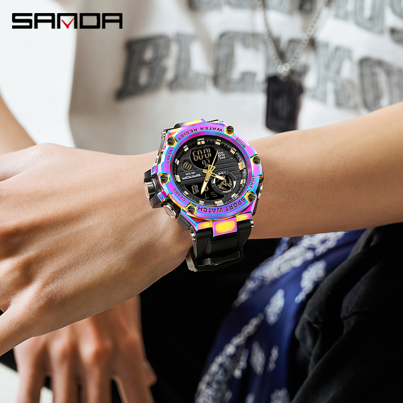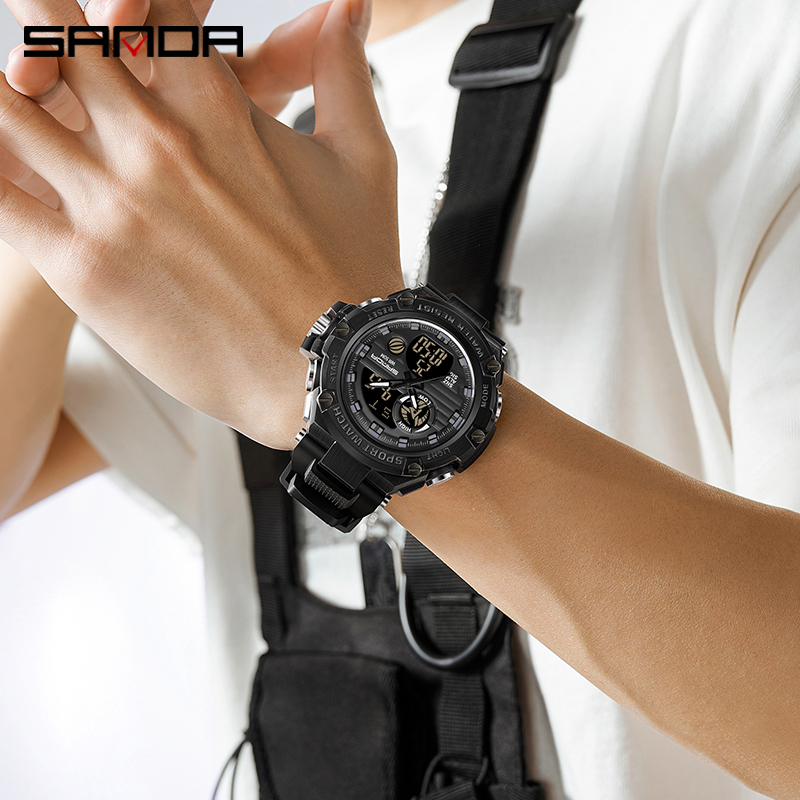 Brand : SANDA Model : 3196 Features : Hours, Minute, Second, Calender, Alarm, EL- Backlight, 12/24h, Count Down, Shockproof Date : Date Case Diameter : 5,1cm Case Thickness : 1,8cm Band Width : 2,7cm Band Length : 26,3cm Case Shape : Round Case Material : Zinc Alloy + ABS Display : Digital Analog Movement : Japan Quartz Power Source : Battery Battery Power : Japan Maxell Dial Window : Arcylic Mirror Band Material : TPU Buckle Type : Pin Buckle Water Resistance: 5ATM