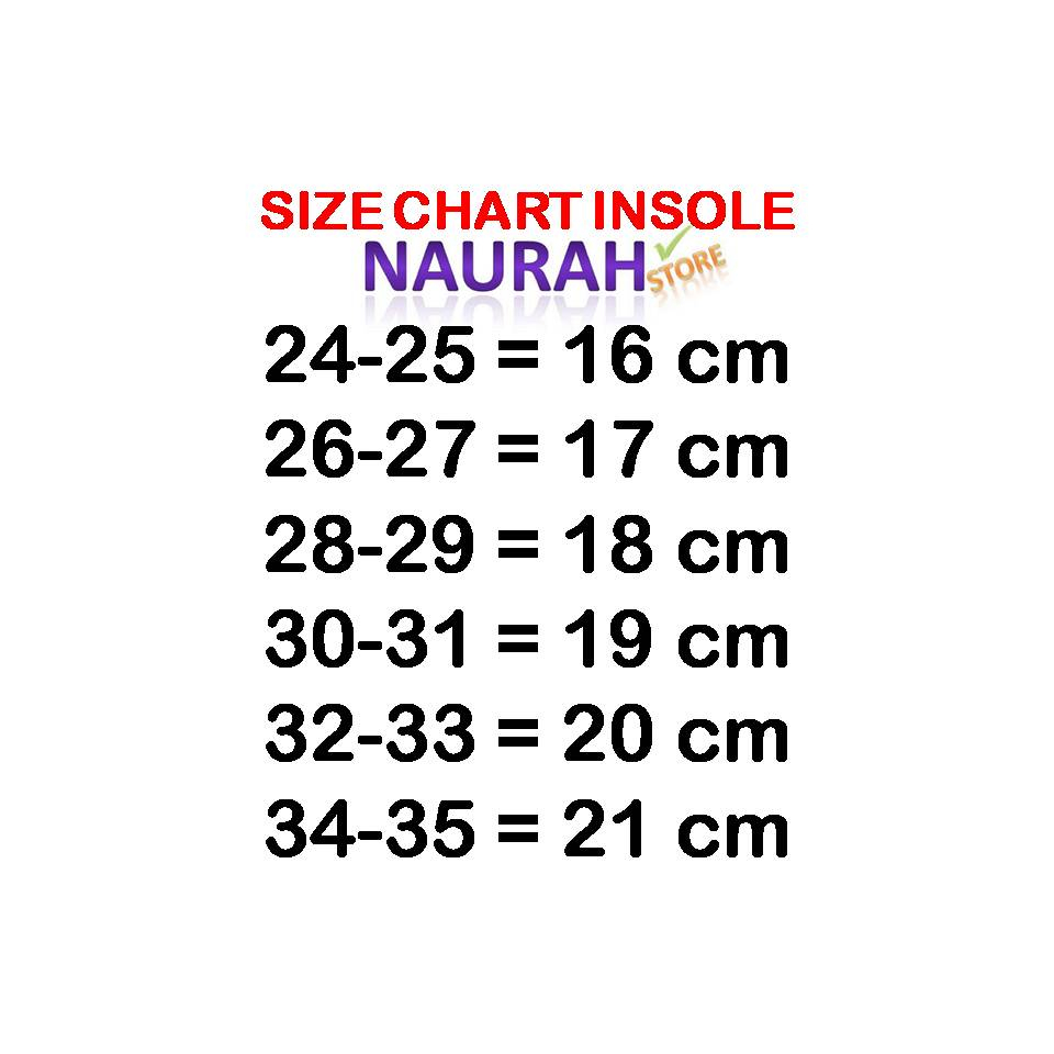 Size Chart Insole: 24-25 = 16 cm 26-27 = 17 cm 28-29 = 18 cm 30-31 = 19 cm 32-33 = 20 cm 34-35 = 21 cm