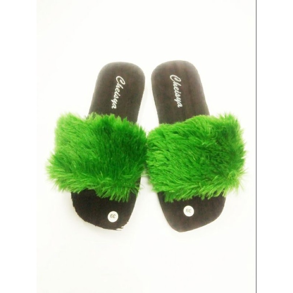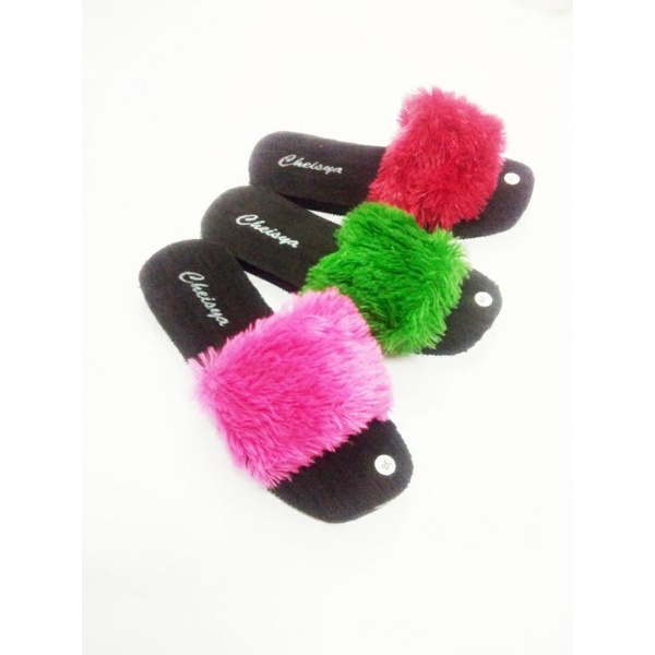 Sandal wanita slop bulu terbuat dari bahan kain bulu rasfur yang bagus dan bahan rabber scrap yang empuk sehingga sangat nyaman dikaki.