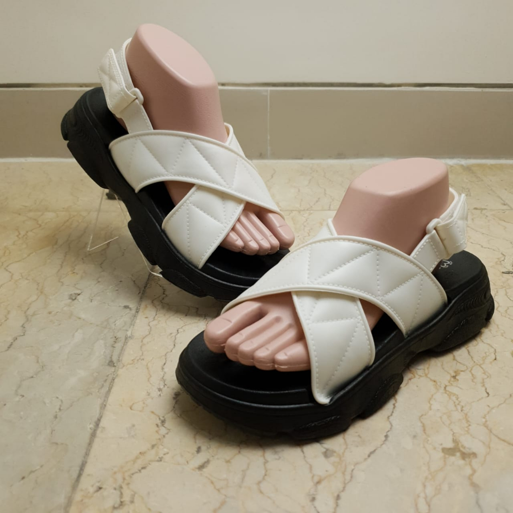 Sandal Platform Wanita Tali Belakang Ban Motif Jahit yang cantik sporty. Sol terbuat dari bahan karet PCU High Quality yang empuk.