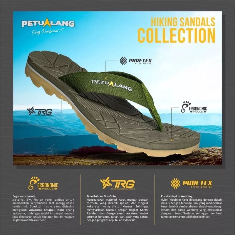 Towuti Clip adalah sandal Gunung jepit serbaguna untuk pemakaian harian ataupun pada saat melakukan kegiatan di sekitar areacamping. Dengan Upper webbing Polypropylene membuat sandal ini menjadi cepat kering dan tidak lembab pada saat dipakai. Didukung dengan Insole eva phylon yg lembut dan memiliki archcookie yang sesuai dengan anatomi kaki orang indonesia pada umumnya. Pada bagian Outsole kita menggunakan material TRUE RUBBER ( GumSole ) yang ringan dan X-trail Grip sistem untuk daya cengkram yang baik, sehingga Outsole ini sangat cocok digunakan untuk area kontur geografis alam indonesia.