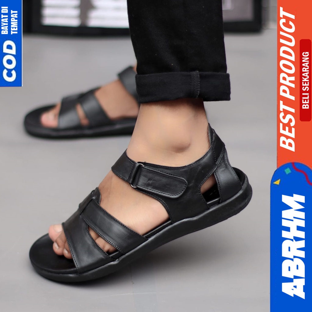 Detail Sandal Pria Slide Casual Kulit Asli Sendal Selop Pria Hitam Abrhm Valkry