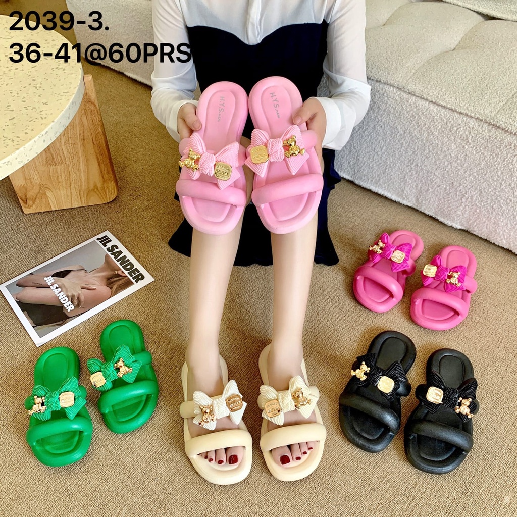 Detail Sandal Slipper Wanita Import PCU Jelly Non-Slip Karet Empuk Model Ban 2 Dengan Variasi Pita Boneka Gold Balance 2039-3